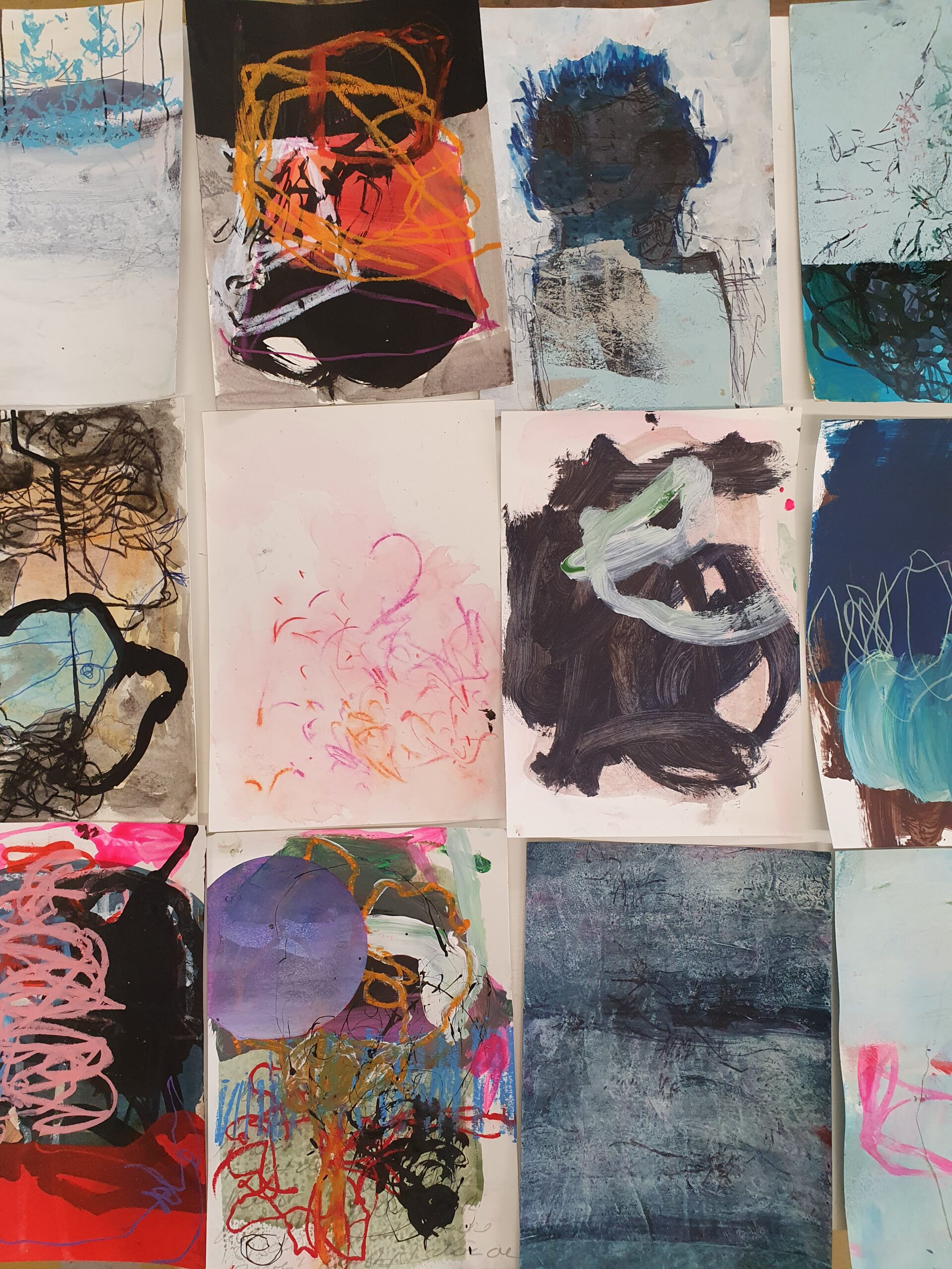 Wir starten mit einfachen Linienzeichnungen. So entstehen in kurzer Zeit die ersten 20 kleinen Zeichnungen auf DIN A5. Nun suchen wir die gelungenen aus und legen diese vorerst zur Seite. Alle übrigen Blätter werden weiter bearbeitet. Wiederum sortieren wir die besten Werke aus und starten mit der nächsten Runde. Wir arbeiten so lange, bis wir mit allen 20 Werken zufrieden sind – dabei geben wir kein Blatt auf! Nach jedem Durchgang werden die Zeichenmaterialien gewechselt: Stifte, Aquarellfarben, Gouachefarbe, Tusche, Kugelschreiber, Kreide, etc. In diesen seriellen Arbeiten gibt ein Blatt den Impuls für das nächste – und sollten wir einmal nicht weiter wissen, überlegen wir nicht lange und wechseln zum nächsten Bild.