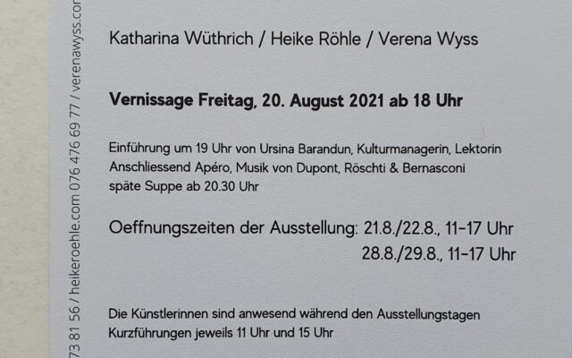 Vernissage: Freitag, 20. August 18 Uhr Galerie „im Gjätt“ Englisberg Gerne lade ich euch ein zur Vernissage und zum Besuch der Ausstellung. Ich präsentiere neue malerische Werke und eine Serie von bisher…